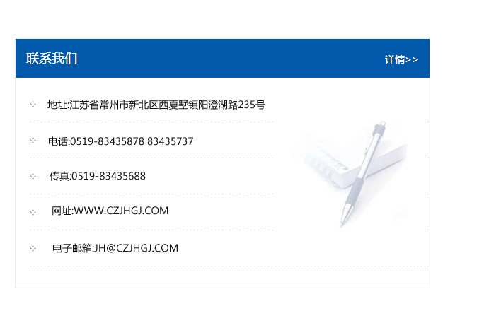 地址:常州市新北區友邦商務大廈1幢16、17層  電話:0519-85101652  傳真:0519-85112595  郵編:213022  網址:www.cz-jiayue_cn.dlpar.com  郵箱:xiajifengaa@163.com